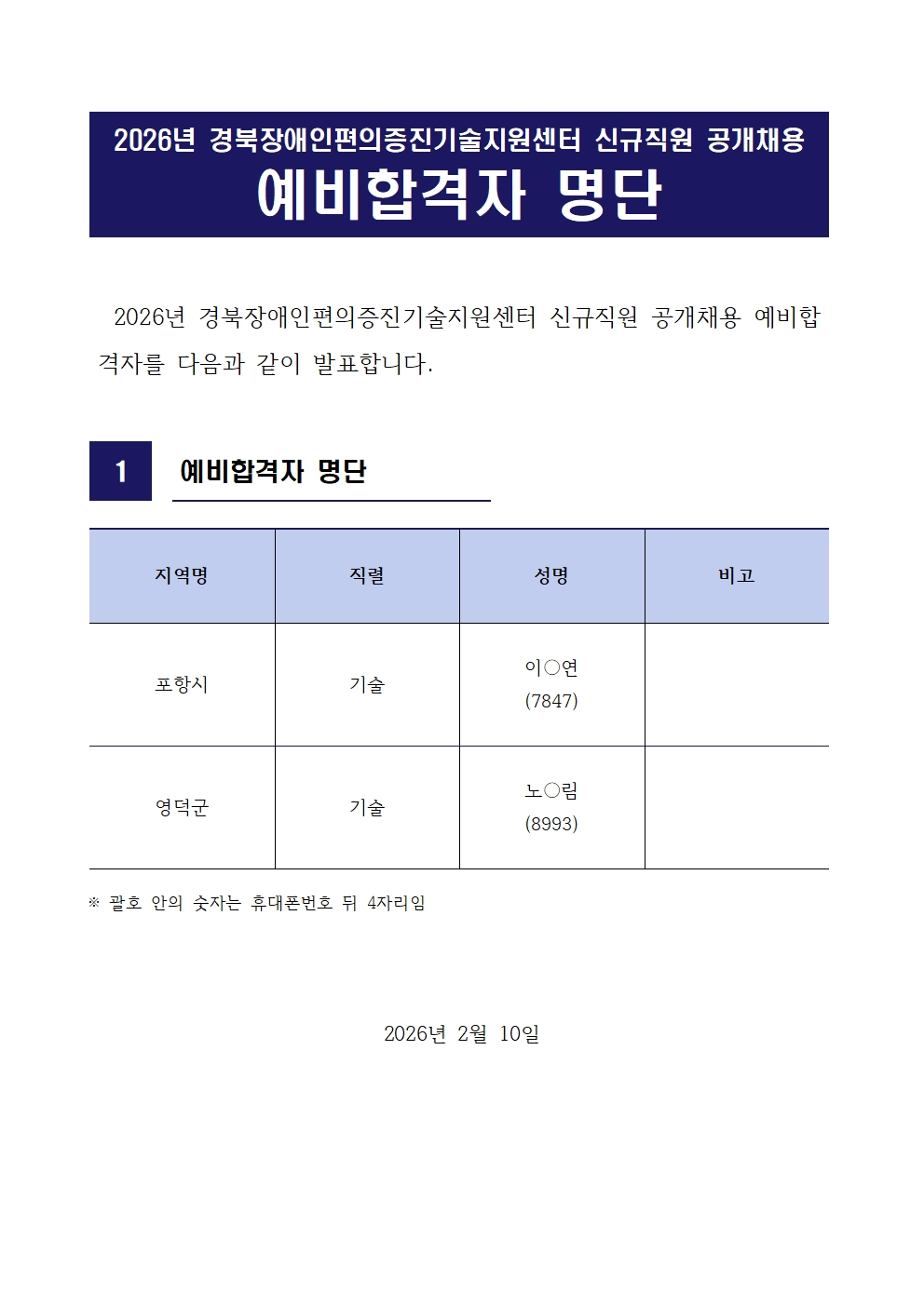 경북장애인편의증진기술지원센터 신규직원 공개채용 예비합격자 명단(포항시센터, 영덕군센터) 최고관리자 0 50 02.10 18:56 경북장애인편의증진기술지원센터 신규직원 공개채용 예비합격자 명단(포항시센터, 영덕군센터)