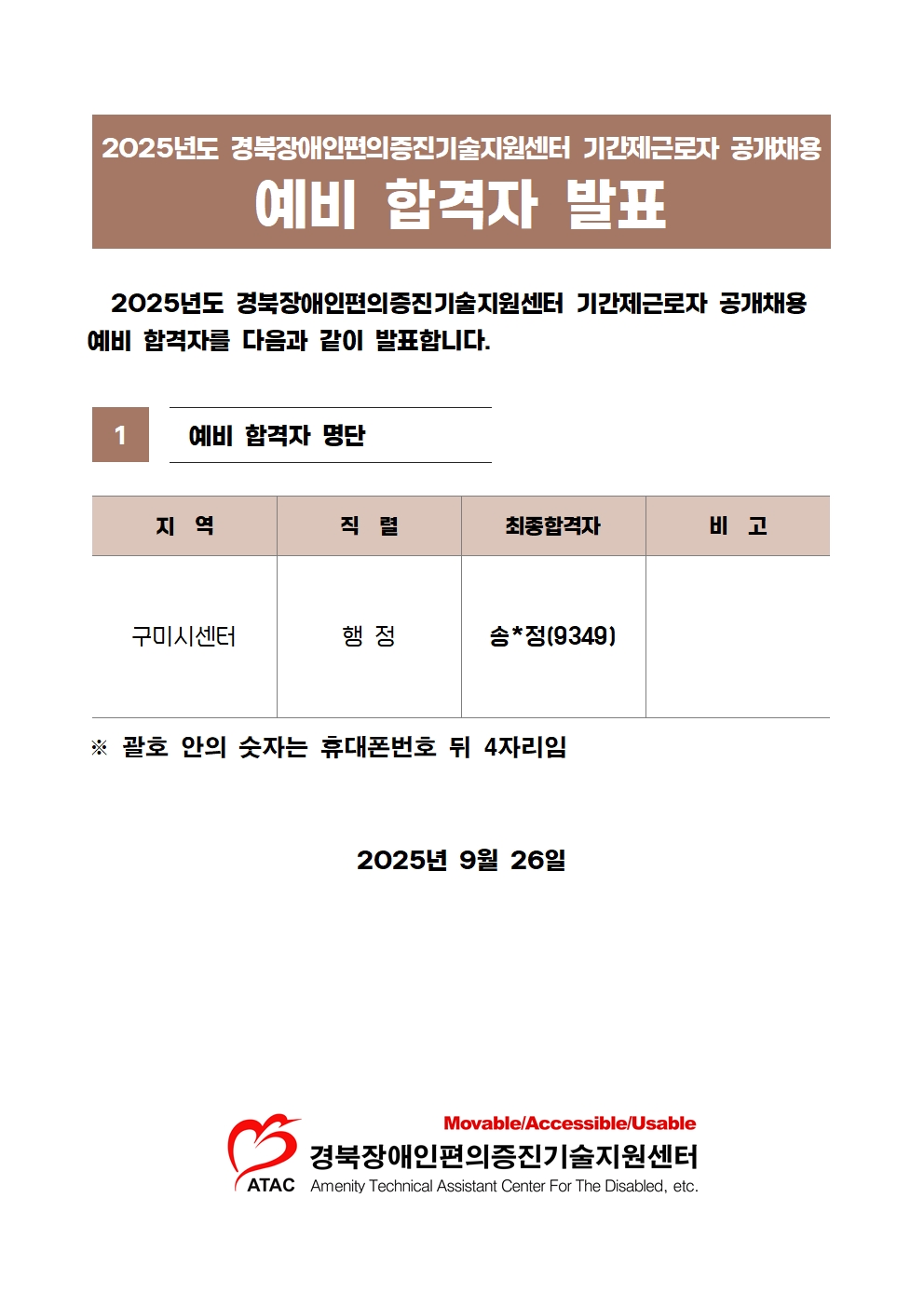 경북장애인편의증진기술지원센터 기간제근로 공개채용 예비합격자 발표(구미시센터) 최고관리자 0 68 09.26 11:34 경북장애인편의증진기술지원센터 기간제근로 공개채용 예비합격자 발표(구미시센터)