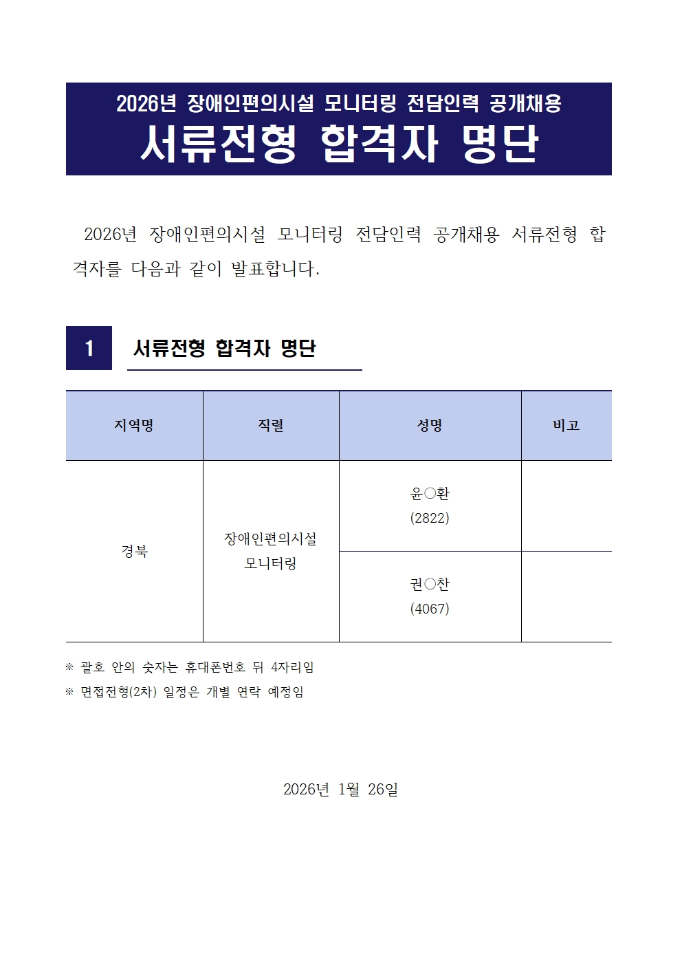 장애인편의시설 모니터링 전담인력 공개채용 서류전형 합격자 명단
