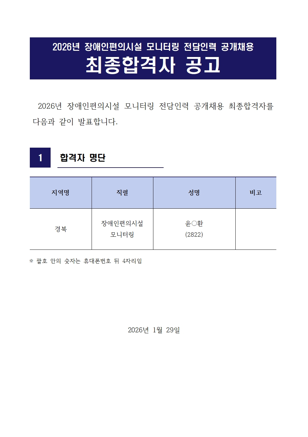 장애인편의시설 모니터링 전담인력 공개채용 최종합격자 명단