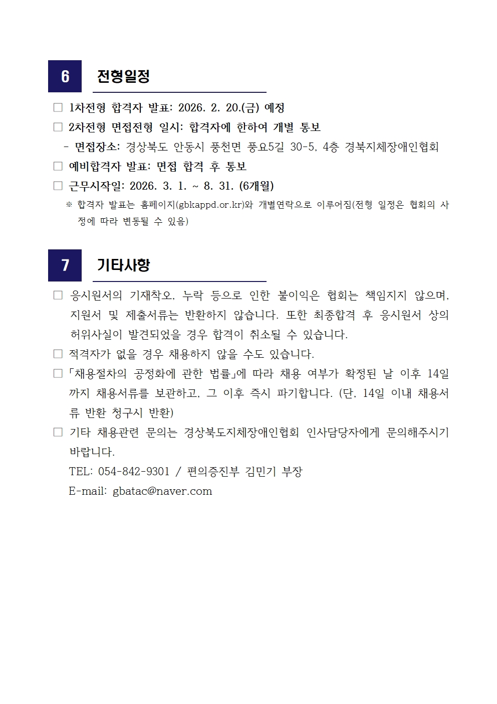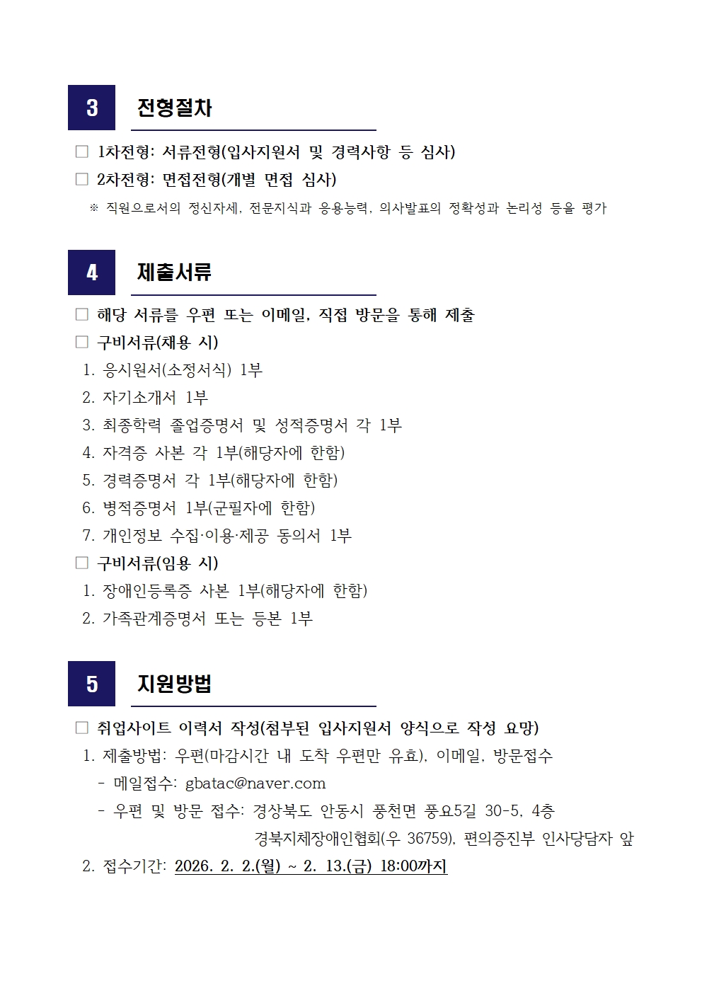 경북장애인편의증진기술지원센터 기간제근로(계약직) 행정직원 공개채용(포항시센터) 최고관리자 0 18 02.02 12:59 2026.02.02 12:59 03. 채용공고문행정직원.hwp (63.0K) + 2 2026.02.02 12:59 00. 입사지원서 양식.hwp (26.5K) + 1 경북장애인편의증진기술지원센터 기간제근로(계약직) 행정직원 공개채용(포항시센터)