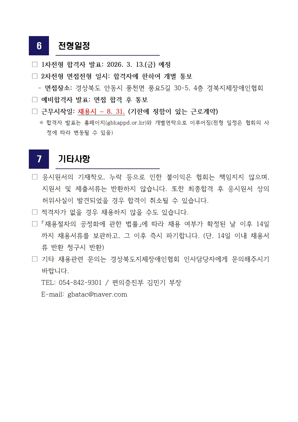 경북장애인편의증진기술지원센터 기간제근로(계약직) 행정직원 공개채용(포항시센터) 최고관리자 0 28 02.24 09:38 2026.02.24 09:38 00. 입사지원서 양식.hwp (26.5K) + 0 2026.02.24 09:38 03. 채용공고문행정직원.hwp (63.0K) + 0 경북장애인편의증진기술지원센터 기간제근로(계약직) 행정직원 공개채용(포항시센터)