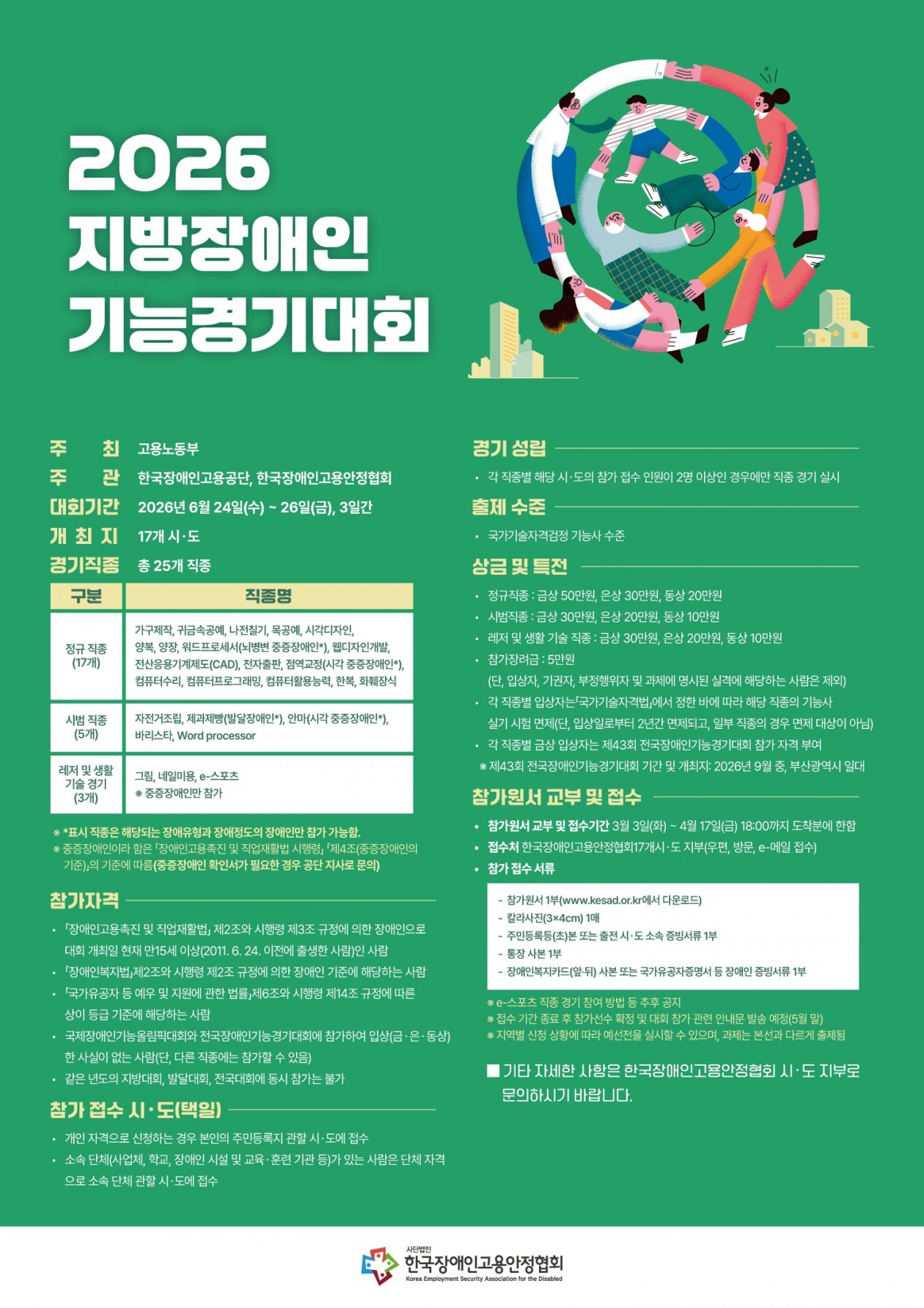 2026년도 경상북도장애인기능경기대회 참가 접수 안내 최고관리자 0 14 4시간전 2026.03.03 12:00 2026년 지방대회 개최 안내문.hwp (144.0K) + 1 2026.03.03 12:00 지방기능경기대회 계획서.hwp (92.5K) + 1 2026.03.03 12:00 지방기능경기대회 참가신청서.hwp (57.0K) + 1 2026.03.03 13:14 2026-지방장애인기능경기대회-포스터.pdf (664.2K) + 1