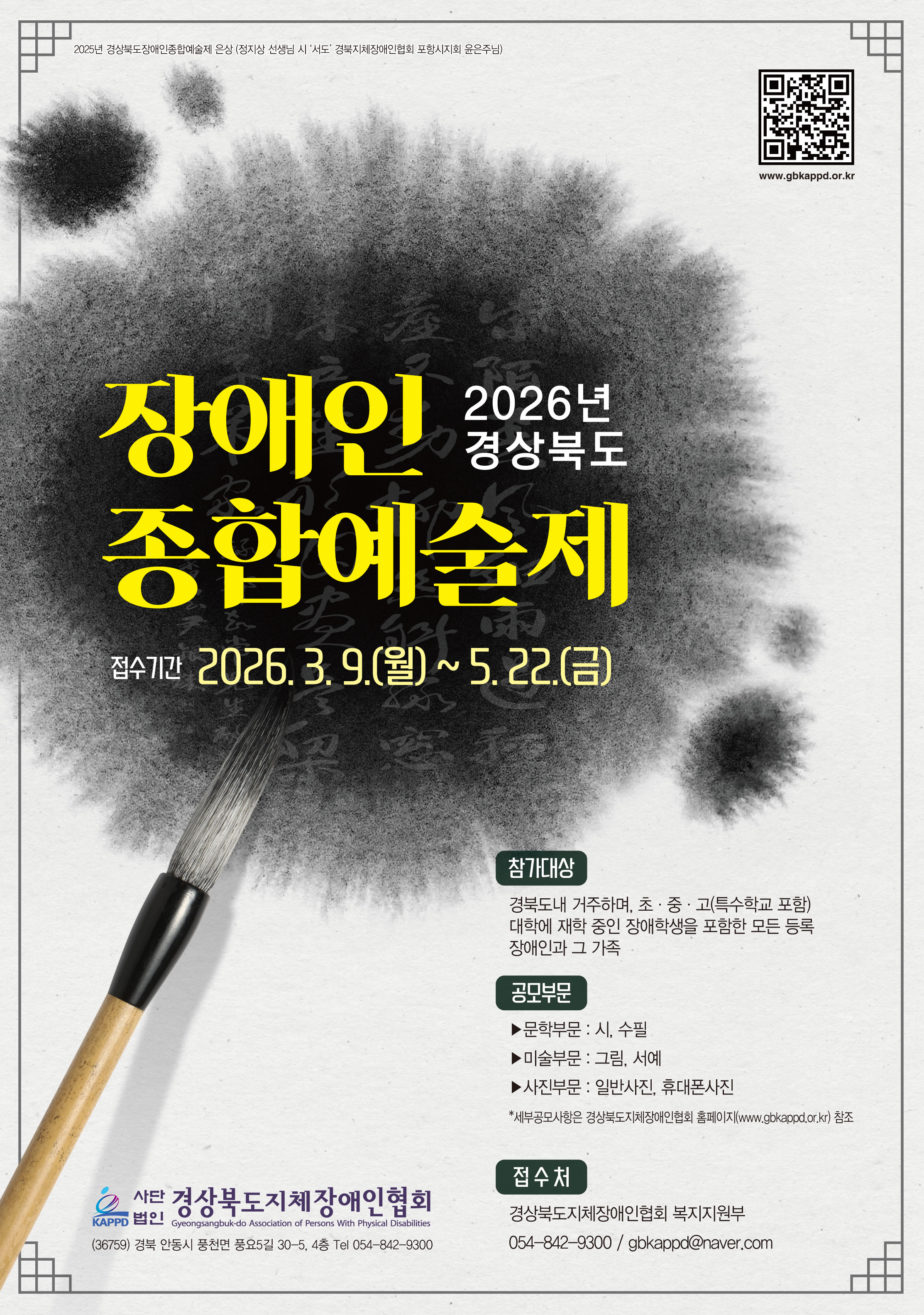 2026년 경상북도장애인종합예술제 접수 안내 최고관리자 0 9 3시간전 2026.03.03 15:01 작품응모신청서.hwp (322.0K) + 2 2026.03.03 15:01 문학부문시.수필.hwp (20.5K) + 2 2026.03.03 13:32 제23회 경북장애인종합예술제 포스터.pdf (1.2M) + 2