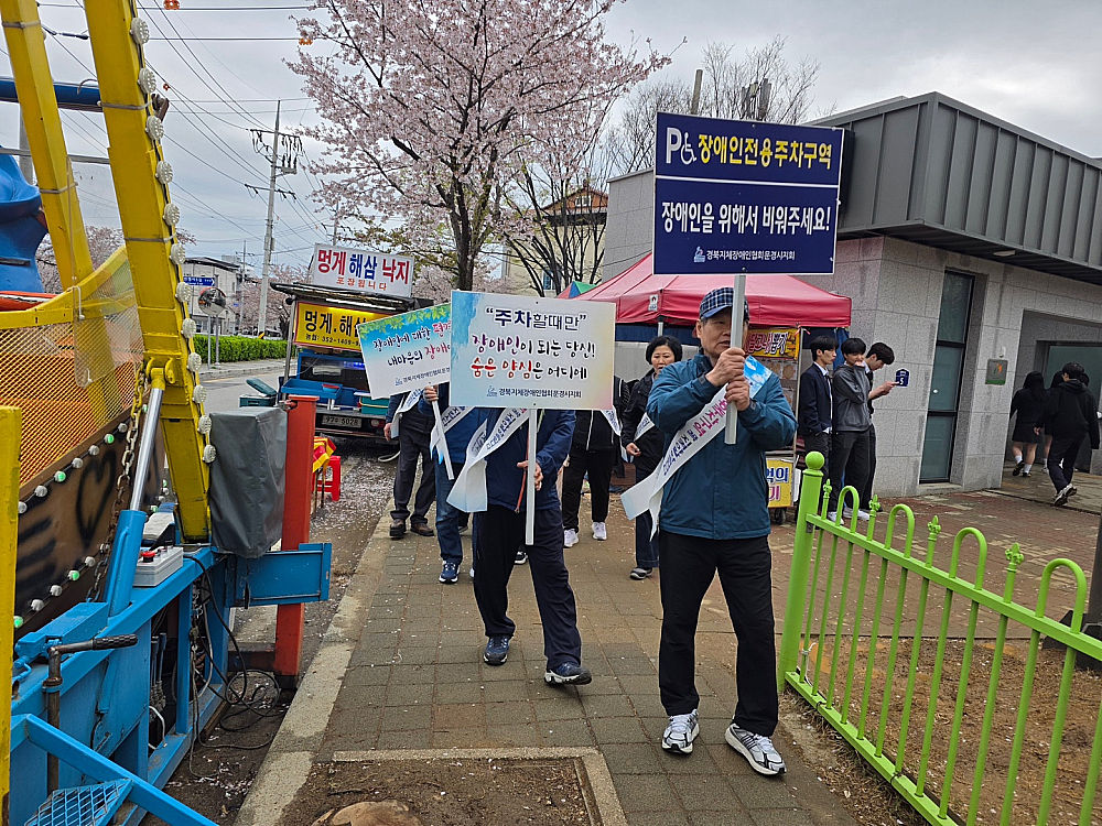 경북지체장애인협회 문경시지회(지회장 박홍진, 이하 문경시지회)는 4월 7일(화), 회원 및 임직원 10여 명과 함께 문경시 반쟁이공원 일대에서 장애인전용주차구역 인식개선을 위한 홍보 및 계도 활동을 실시했다.