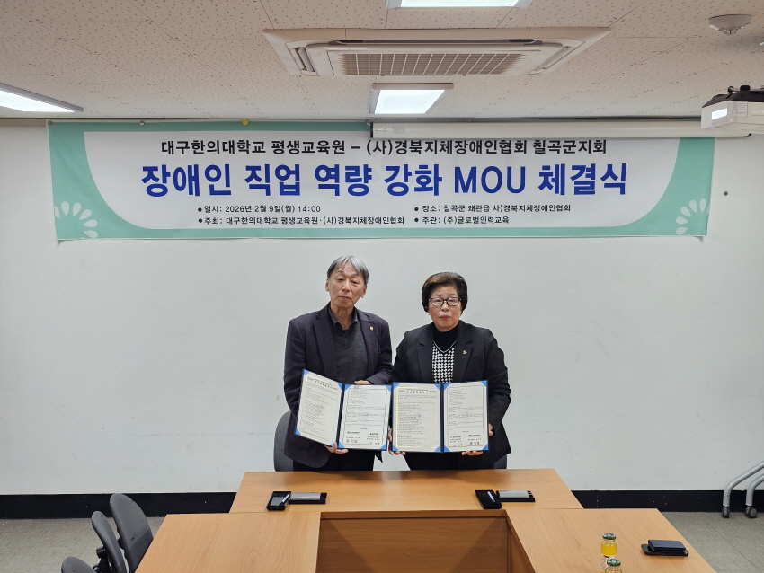 경북지체장애인협회 칠곡군지회(지회장 윤명옥, 이하 칠곡군지회)와 대구한의대학교 평생교육원(원장 권기찬)은 2월 9일, 칠곡군지회 세미나실에서 장애인의 직업 역량 강화와 평생교육 활성화를 위한 업무협약(MOU)을 체결했다.