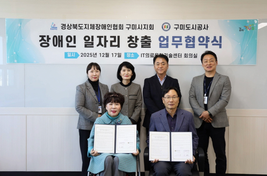 경북지체장애인협회 구미시지회(지회장 오광희, 이하 구미시지회)는 12월 17일 구미도시공사(사장 이재웅)와 함께 장애인 일자리 창출 업무 추진 협약식을 진행하였다.