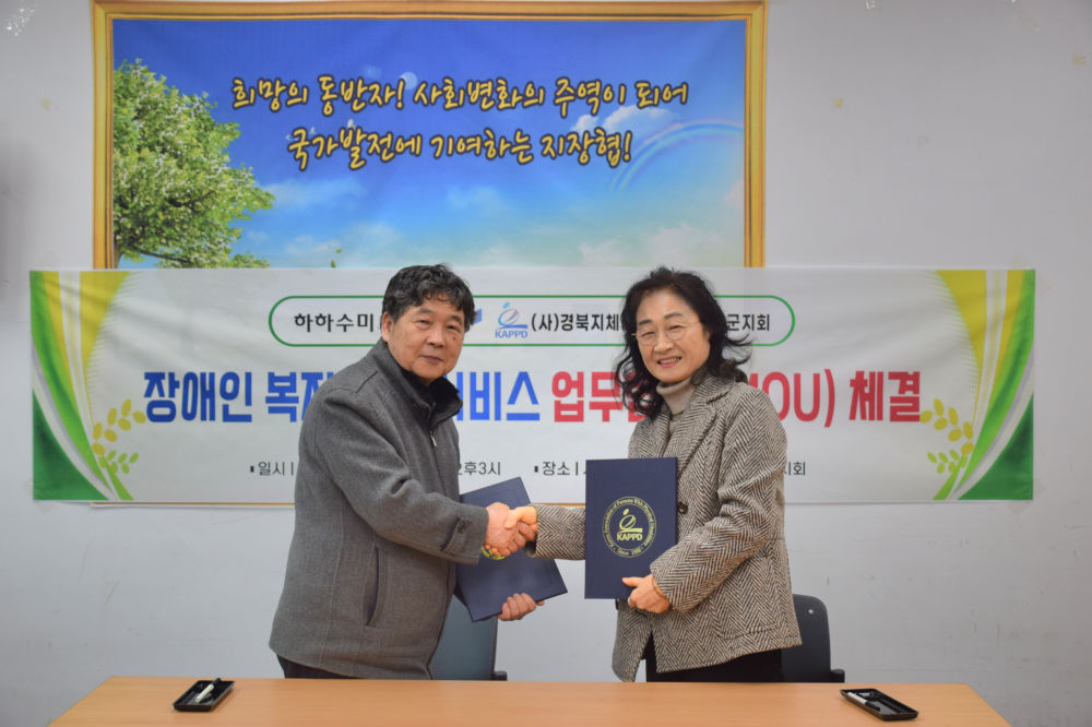 경북지체장애인협회 성주군지회(지회장 이재근, 이하 성주군지회)는 지난 2월 24일(화), 지회 프로그램실에서 ㈜하하수미(대표 이수미)와 지역 장애인 복지증진을 위한 업무협약(MOU)을 체결했다.