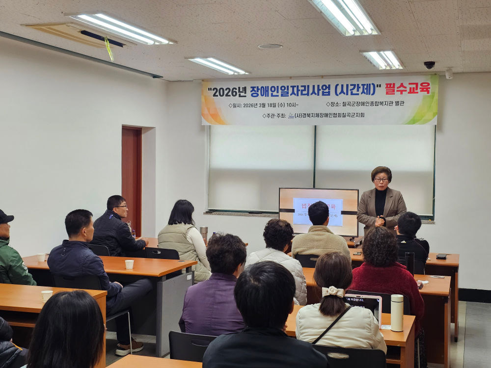 경북지체장애인협회 칠곡군지회(지회장 윤명옥, 이하 칠곡군지회)는 2026년 3월 18일, 칠곡군장애인복지관 별관에서 「2026년 칠곡군장애인일자리사업(시간제) 참여자 필수교육」을 실시하였다.