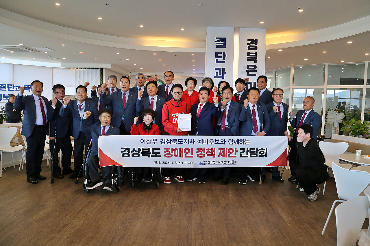 이철우 경상북도지사 예비후보와 함께하는 경상북도 장애인 정책 제안 간담회 최고관리자 0 74 04.08 15:45 · 행사명: 이철우 경상북도지사 예비후보와 함께하는 경상북도 장애인 정책 제안 간담회· 일시: 2026. 4. 8.(수) 11:00· 장소: 이철우 경사북도지사 예비후보 선거사무소