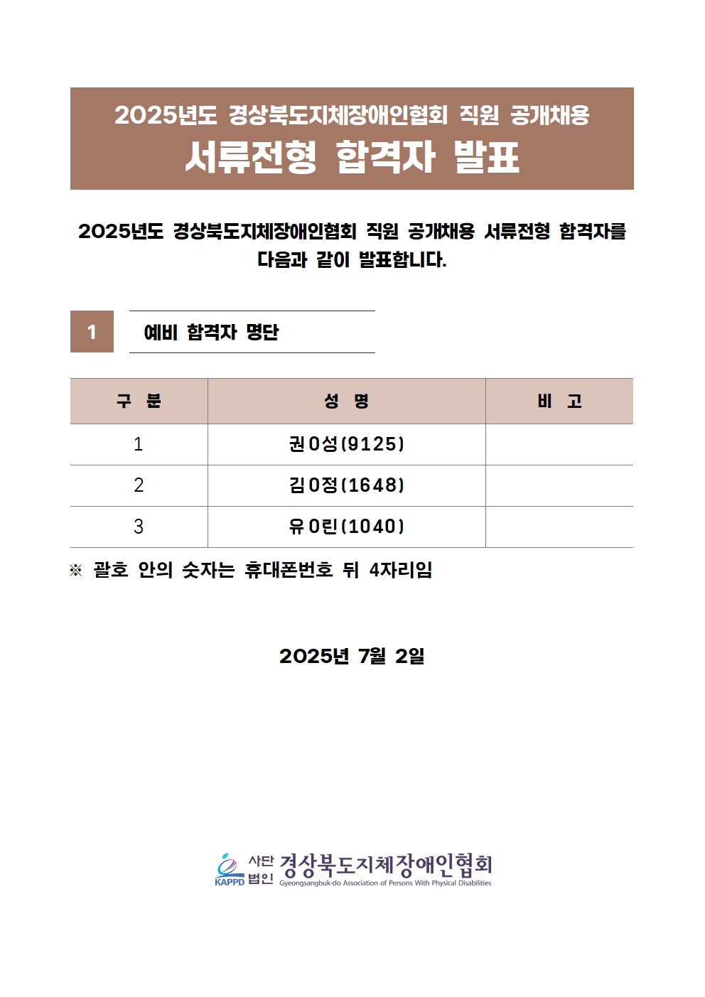 2025년도 경상북도지체장애인협회 직원 공개채용 서류전형 합격자 공고