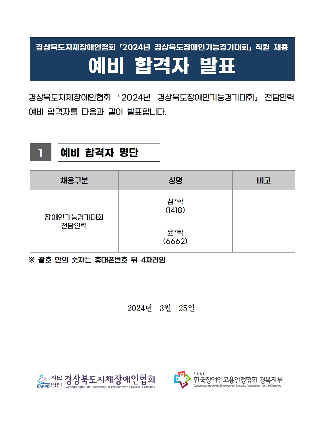 경상북도지체장애인협회 직원 채용 예비합격자 공고(기능경기대회 전담인력)