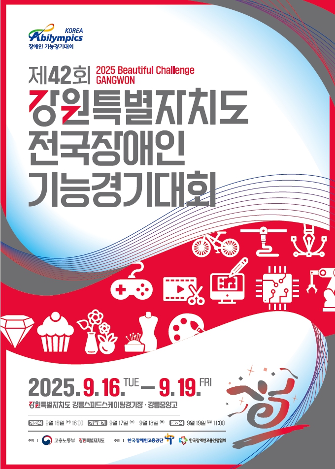 제42회 전국장애인기능경기대회 개최 안내 최고관리자 0 279 08.27 14:13 2025.08.27 14:13 제42회 전국장애인기능경기대회 계획안.pdf (488.5K) + 29 제42회 전국장애인기능경기대회 개최 안내○ 대 회 명: 제42회 전국장애인기능경기대회○ 대회기간: 2025. 9. 16.(화) ~ 19.(금) / 4일간○ 대회일정 - 개회식: 2025. 9. 16.(화) 16:00, 강릉스피드스케이팅 경기장 - 본경기: 2025. 9. 17.(수) ~ 18.(목) (양일간) / 강릉스피드스케이팅경기장 및 강릉중앙고등학교 - 폐회식: 2025. 9. 19.(금) 11:00, 강릉스피드스케이팅 경기장○ 세부사항은 계획서 참조