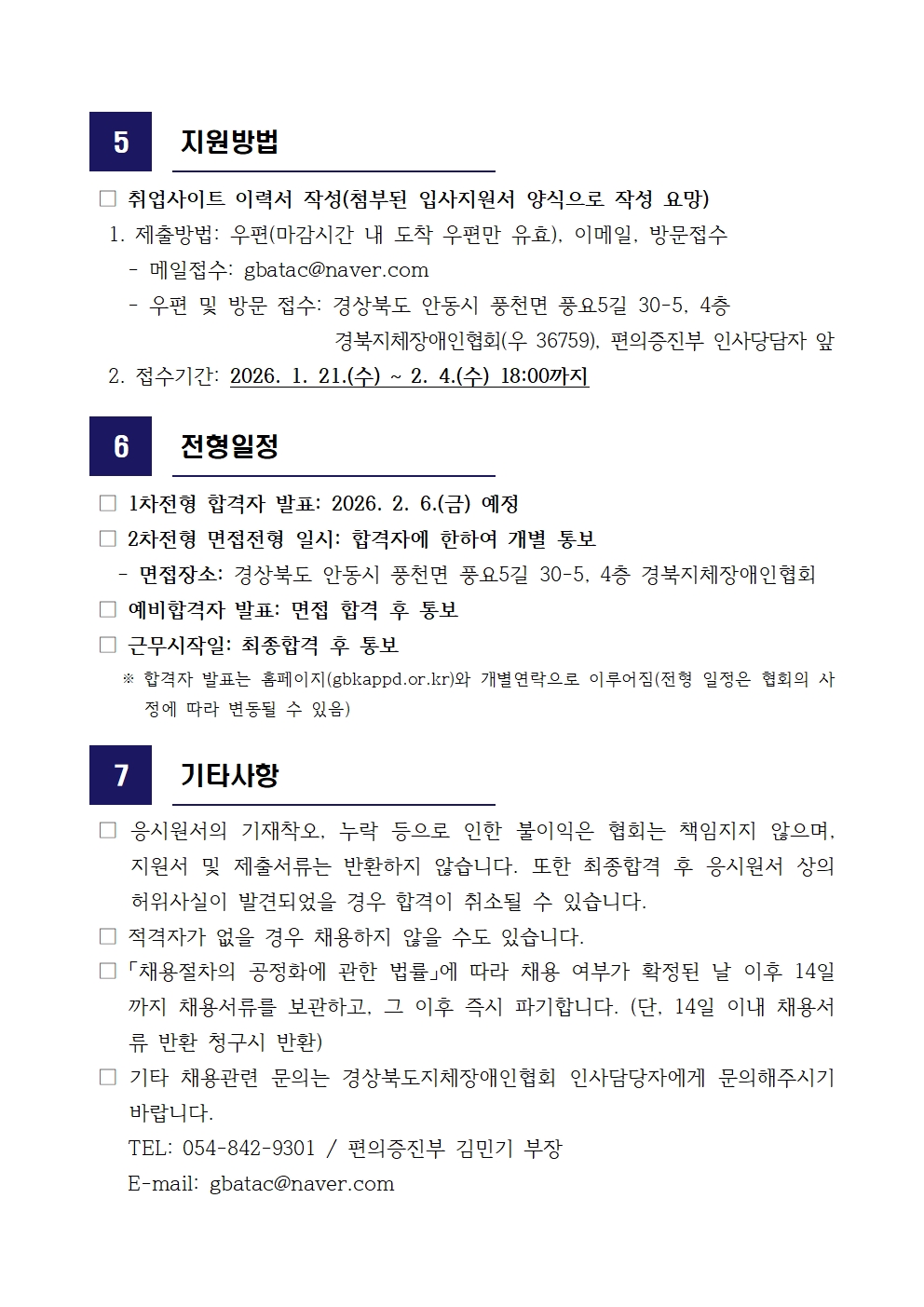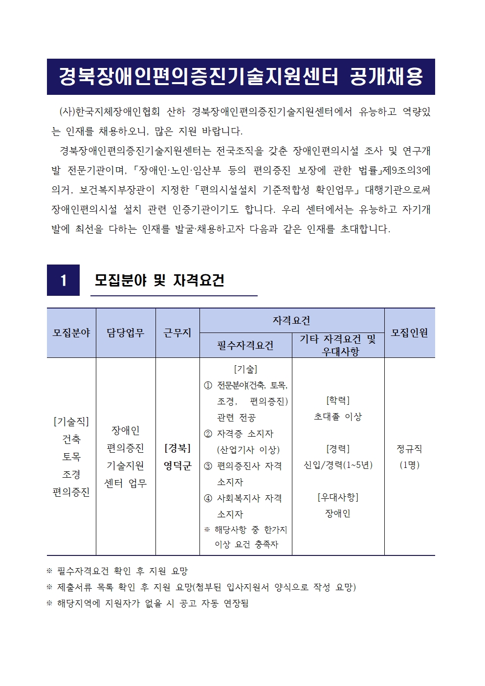 경북장애인편의증진기술지원센터 기술직원(사회복지사) 공개채용(영덕군센터) 최고관리자 0 119 01.21 10:52 2026.01.21 10:52 02. 채용공고문영덕군-기술직 완화채용.hwp (63.5K) + 3 2026.01.21 10:52 00. 입사지원서 양식.hwp (26.5K) + 3 경북장애인편의증진기술지원센터 기술직원 공개채용(영덕군센터)