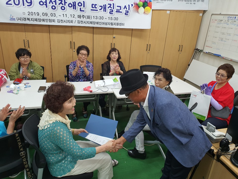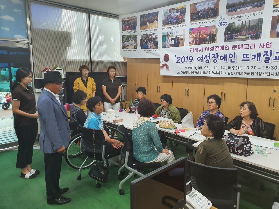 (사)경북지체장애인협회 김천시지회(지회장 박희만)는 9월 3일 지회 회의실에서 여성장애인 및 임직원 등 15여명이 참석한 가운데 “여성장애인 뜨개질교실” 개강식을 가졌다.