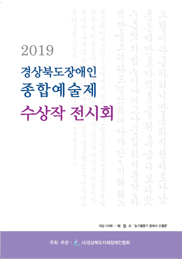 이번 경북장애인종합예술제 수상작 작품전시회는 (사)경북지체장애인협회에서 지난 3월 18일부터 4월 30일까지 2개월간 접수된 각 7개 부문(서예, 시, 수필, 그림, 사진, 휴대폰 사진, 산업공예 등)별 총 355점을 신청받아 심사했다. 이에 지난달 6월 31일 안동그랜드호텔서 개최된 ‘2019년 경상북도 장애인종합예술제’에서 부문별 51점을 결정해 경주시지회 박점수 씨가 농가월령가 중에서 ‘오월경’이란 작품으로 대상 수상한 바 있다.
