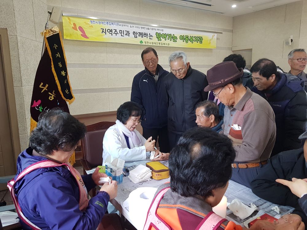 이렇게 구성된 수지침 봉사단은 지역 내 한약축제 등의 행사에서 수지침 부스를 운영하여 수백명의 관광객을 대상으로 수지침 체험을 제공하고 있으며, 매년 복지관에 주기적으로 무료급식을 제공해 장애인들에게 양질의 점심을 제공하는 등 다양한 활동을 하고 있다.