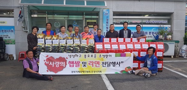 경상북도지체장에인협회 문경시지회(지회장 박홍진)는 9월 17일 지회사무실에서 한가위 추석을 맞이해 소외된 장애인 회원들과 이웃들에게 따뜻한 온정을 나누고자 ‘풍요롭고 행복한 추석맞이 사랑의 햅쌀 및 라면 전달’ 행사를 가졌다.