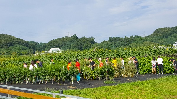 이어서 작물이 재배되는 시험장으로 이동하여 고추를 비롯한 가지, 포도, 사과 따기 체험을 하면서 즐거운 한때를 보냈다.