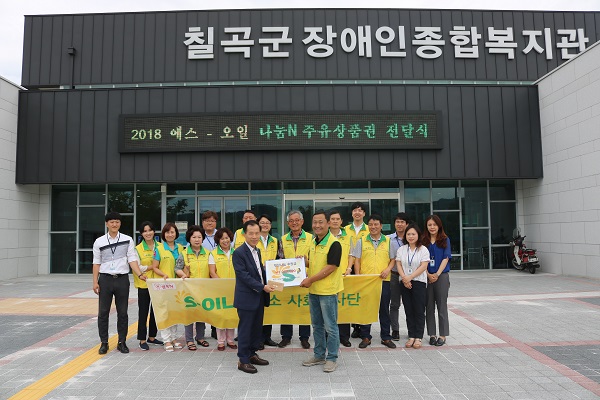 한국지체장애인협회 칠곡군장애인종합복지관(이하 칠곡장복)은 에쓰오일(S-OIL) 본사와 한국사회복지협의회가 진행하는 2018 에쓰오일(S-OIL) ‘주유소 나눔N 캠페인’ 사업에 선정되어 7월 11일에 ‘에쓰오일(S-OIL) 주유소 사회봉사단'으로부터 100만원 상당의 주유상품권을 전달 받았다.